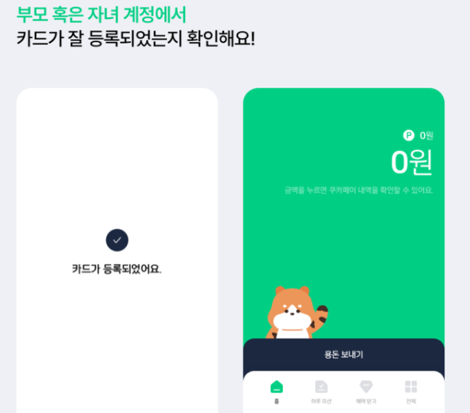 카드 등록이 완료되면 이제 부모님은 아이쿠카 앱을 통해: